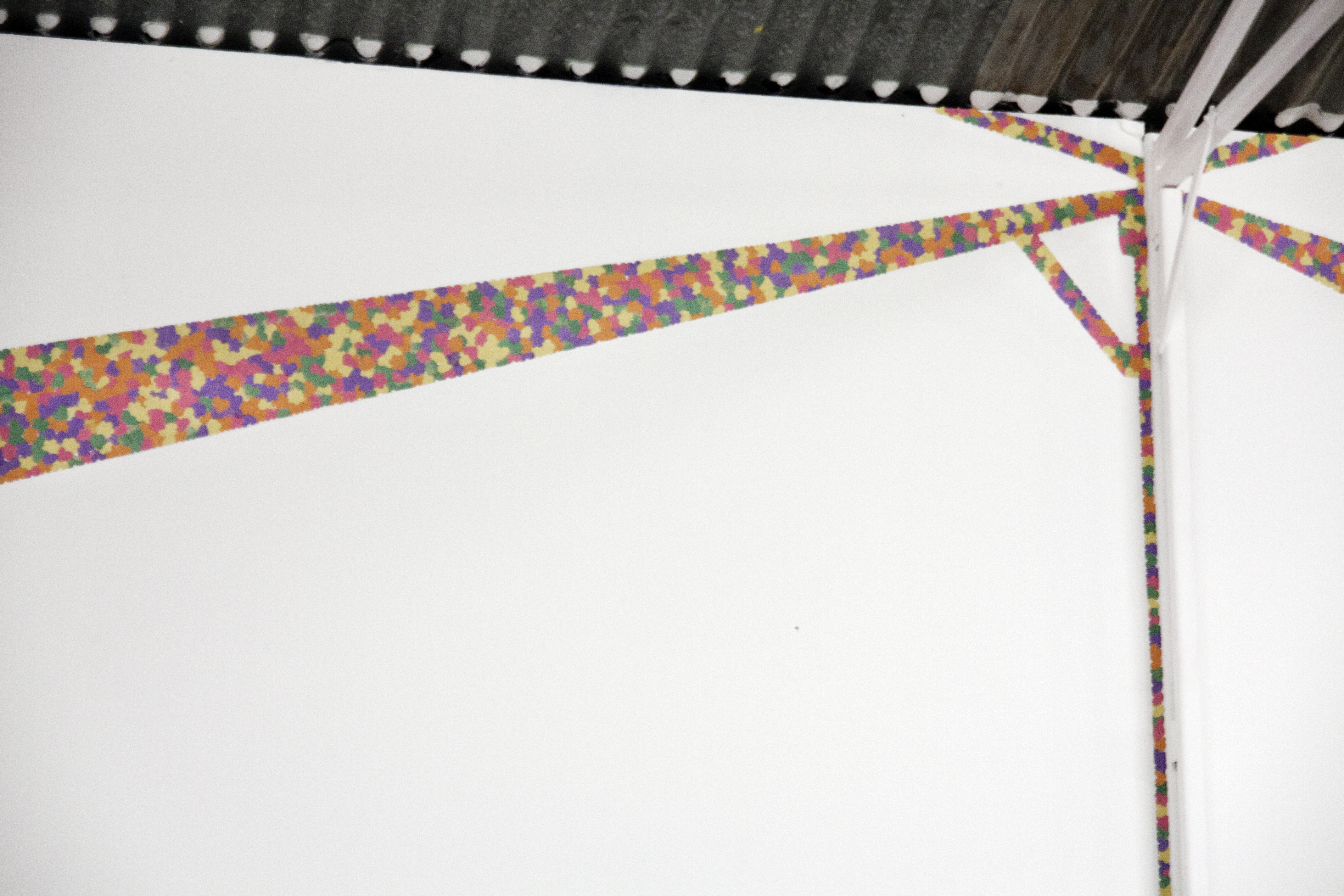 Hand punched paper shapes glued in place of the shadows on the wall, cracks filled with Posca paint pens.